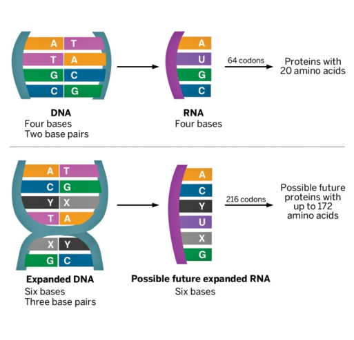 遗传字母表具有三个碱基对,而不是通常的六碱基的mRNA,将可能制成更加多样化的蛋白。 A =腺嘌呤,C=胞嘧啶,G=鸟嘌呤,T =胸腺嘧啶,X = DNAM,Y = d5SICS。