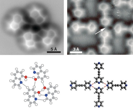 (右)双(p - 吡啶基)乙炔四聚体的AFM图像显示了意外的电子密度(如箭头所示)。