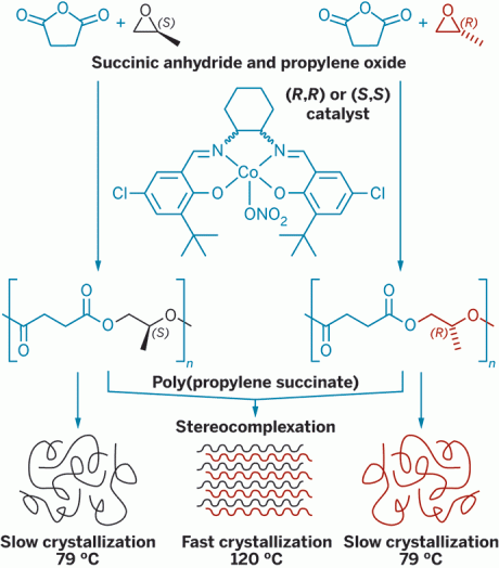 一种新的手性钴催化剂可以将(R) - 或(S)- 氧化丙烯与琥珀酸酐共聚成(R) - 或(S) - 聚(丙烯琥珀酸酯)。当这两种聚合物相结合时,形成具有良好热性能的立构材料。