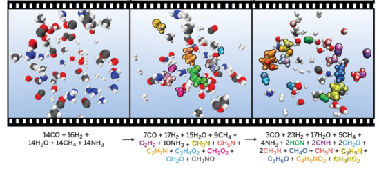 从400皮秒的模拟经典的尤里- 米勒实验的三个框架。反应开始用简单的化合物(左),逐渐到(中和右)。