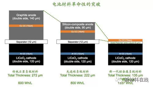 根据美国能源部的定义,第一代锂电池使用石墨负极,最多能达到600 Wh/L的能量密度; 第二代锂电池使用硅负极,最高能取得 800 Wh/L左右的能量密度;第一代和第二代都属于传统的锂离子电池。而第三代锂电池将使用更高能量密度的金属负极甚至做到无负极,能超过 1000 Wh/L 的能量密度。