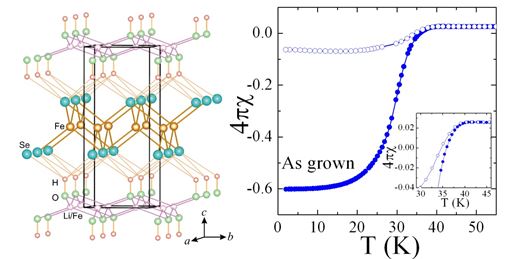 图:(Li0.8Fe0.2)OHFeSe超导体的晶体结构(左)和磁化率曲线(右)