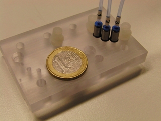 利用这种小型的多器官芯片(大小比对于一欧元硬币)和三个独立的微电路,可以研究某些特定的肾细胞再生(来源:弗劳恩霍夫技术手册)