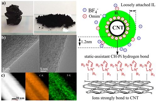 图1. 左图:a)离子液体/碳纳米管复合胶体与复合材料图像 b,、c)HHT与其相应复合材料的显微图及Mapping图像;右图:复合材料机理图