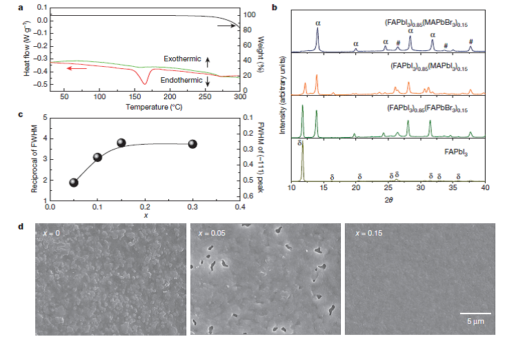 在众多针对制造廉价、高效太阳能电池的材料和方法中,基于无机-有机卤化铅杂化的钙钛矿材料因其高的能量转化效率显引起人们广泛关注。目前为止所报道的高效钙钛矿太阳能电池的材料都是基于甲氨基卤化铅的。最近,Nam Joong Jeon等人报道了基于硝酸甲脒碘化铅(FAPbI3)和甲氨基溴化铅(MAPbBr3)两种钙钛矿材料为吸光层的双层太阳能电池结构,FAPbI3虽然稳定性较差,但带隙很窄,因此是一种有前景的电池材料。他们研究了钙钛矿层的相稳定性和形貌,还研究了在表征电流-电压关系时会出现的滞后现象,以及整个电池的效率与化学组成间的关系。研究表明,将MAPbBr3掺入到FAPbI3中后,可以使FAPbI3相变得更稳定,在1个太阳照度下,1平方厘米面积器件的能量转化率可以超过18%。这些发现进一步凸显了有机-无机卤化铅钙钛矿材料用于光伏器件中的潜力。(Nam Joong Jeon et al. Nature doi:10.1038/nature14133)