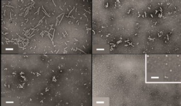“母”到'子'纳米粒子-一系列透射电子显微镜(TEM)图像显示圆柱母体纳米粒到球形子纳米粒子的过渡。