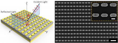 左边,圆偏振光被超材料的四分之一玻片反射后转换直线偏振波。右边,从上面观察所制造的纳米结构的FESEM图像显示的纳米棒阵列。(底部比例尺-400nm,顶部比例尺-100nm)