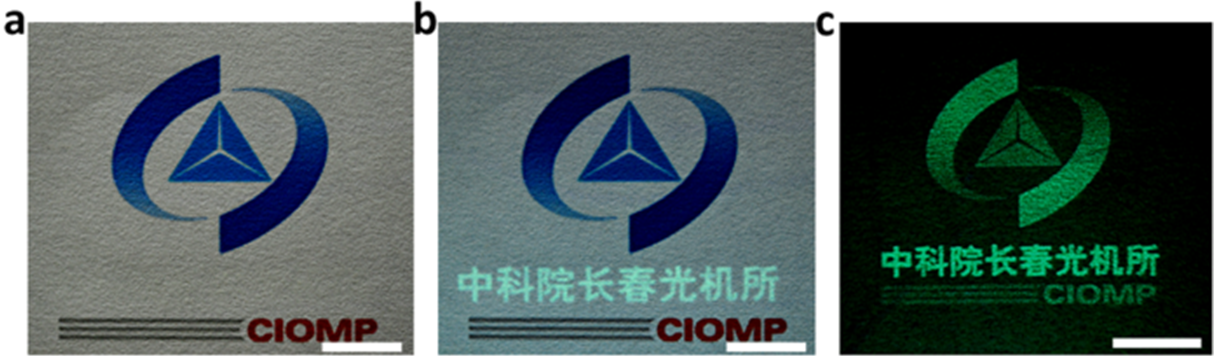图2 在可见光(a)和可见兼紫外光(b)照射下用纯水墨盒和HP-46三色墨盒打印在“超级碳纳米点”复合纸上中科院长春光机所所标的照片 (c)纯水墨盒打印“超级碳纳米点”复合纸上中科院长春光机所所标紫外光照下的照片。(标尺=1厘米)