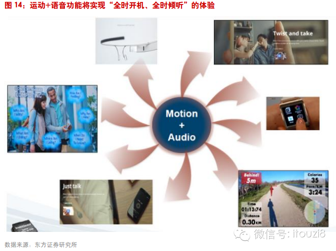 可穿戴设备需要麦克风来读取用户的语音信息,也需要音筒来输出设备的信号,除了简单的语音通话等功能外,事实上MEMS麦克风在语音识别、背景识别(搞清楚用户的状态)、关键词识别等应用上也非常符合未来的趋势。运动加上语音识别功能提供的Always-onalwayslisten(全时开机、全时倾听)的体验。可以一直保持开机状态,随时随地使用这些功能。这些功能将在手机和可穿戴上面很快获得应用。