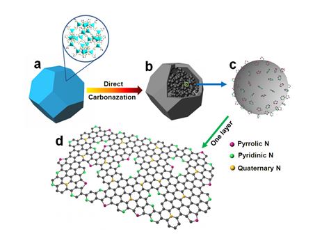 氮掺杂类石墨烯粒子制备过程和氮掺杂模型示意图。(a) ZIF-8;(b) 富氮碳多面体(含大量类石墨烯粒子);(c) 一个放大的类石墨烯粒子,边缘氮掺杂;(d) 一层石墨烯的边缘和晶格里三种氮结合构型。