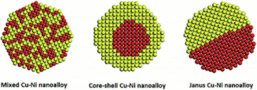 Miguel José-Yacaman采用理论纳米热动力学模型来研究不同形状的Cu-Ni纳米粒子,如立方体和球状。研究人员发现,该合金只能在温度高于该两种金属混溶温度时合成。如果温度低于混溶温度,则该合金不能形成,相反会形成具有“两面性”纳米颗粒。