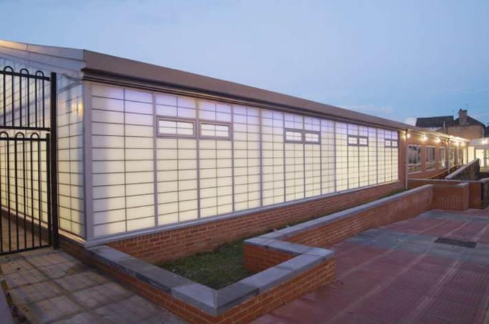 除了绝缘,气凝胶也有被半透明的独特性质,有可能被重新定义为“玻璃房子”。赫姆斯沃斯管理办公室(阿特金斯建筑师)的照片来自于David Jewel.