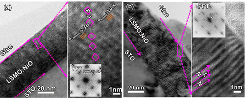图1是两种理想的微观组织结构的示意图,其中,L代表LSMO,N代表NiO。LSMO和NiO两相相间,构成纳米棋盘状结构和纳米柱状结构。其中,NiO相的尺寸应控制在1~2 nm,以形成纳米尺度的LSMO/NiO/LSMO磁隧道结。利用LSMO/NiO/LSMO的隧穿电阻以及LSMO/NiO界面的散射作用提高复合薄膜的磁电阻;通过控制LSMO母相的应变以及由其引起的居里温度和金属-绝缘转变温度的变化,在增大低场磁电阻的同时提高低场磁电阻效应的发生温度。之所以选用反铁磁、半导体的NiO作为第二相,主要考虑以下几方面的因素:1) NiO与LSMO具有良好的晶格匹配度。该课题组研究人员在研究LSMO:NiO颗粒复合薄膜、层状复合薄膜的交换偏置现象时发现,在NiO/LSMO界面,NiO和LSMO具有良好的晶体学外延关系(Journal of Applied Physics, 113 (2013), 223903., IEEE Transactions on Magnetics, 50 (2014), 1000304)。2) 由于Ni2+ (0.69Å) 离子半径远大于Mn3+和Mn4+离子半径(分别为:0.58 Å 和 0.53 Å),所以Ni2+不会替代Mn3+和Mn4+离子而进入LSMO晶格。这样,就避免了由于成分变化而引起的LSMO磁性、居里温度和金属-绝缘转变温度等的变化。3) 由于NiO的半导体特性,可以在LSMO/NiO界面形成比较高的势垒差以满足磁隧道结中高阻态第二相的要求。4) 如果能控制NiO尺寸和分布,就有可能形成由NiO和LSMO构成的LSMO/NiO/LSMO隧道结。图2 是所制备的具有纳米棋盘结构和纳米柱状结构的LSMO-NiO复合薄膜的TEM和HRTEM断面照片。