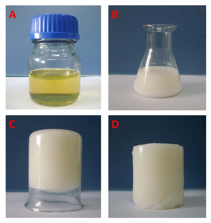 单组份聚氨酯水凝胶水中乳化及凝胶图片。A:实验室合成的亲水性聚氨酯树脂;B:水中自乳化;C:与水反应后形成的水凝胶 D:所形成的凝胶具有良好的自支撑性能。