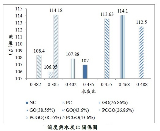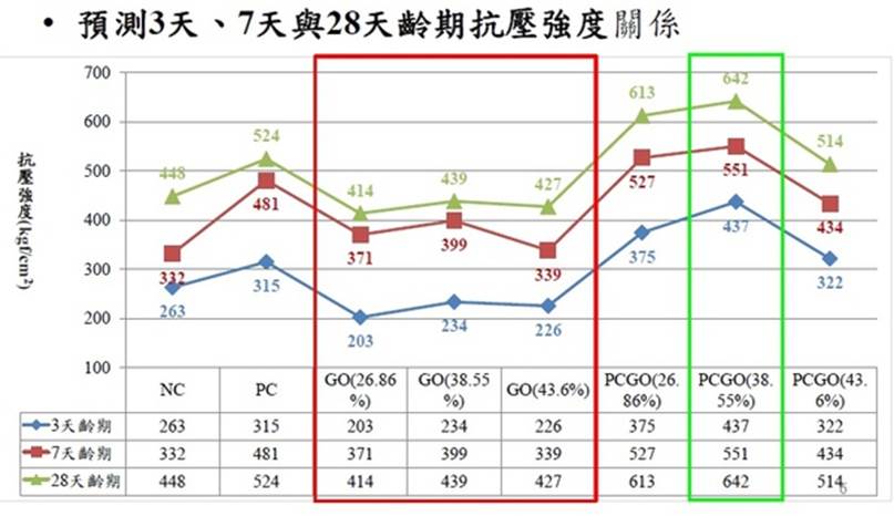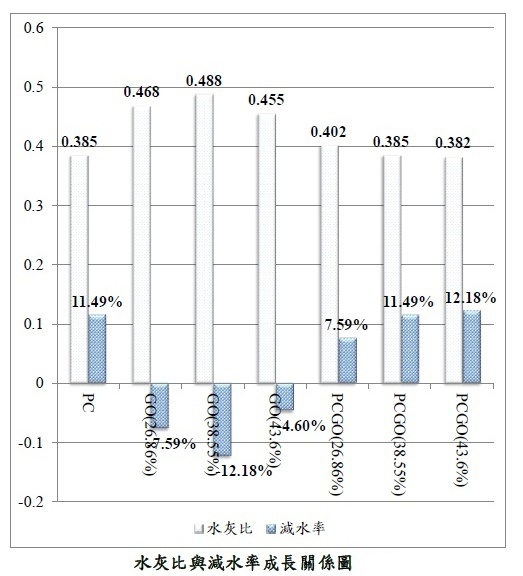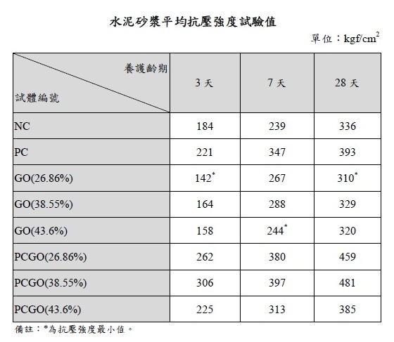 整体抗压强度成长率 7 天龄期于大均等 3 天与 28 天龄期表现,PCGO 氧化率愈高,3 天龄期抗压强度成长率愈高,由文献得知 PCGO 氧化率 25.53% 时,3天龄期抗压强度成长率已大於 28 天齡期表現,故初步推斷添加化學劑具有早強效果 ,氧化率愈高效果明顯 。