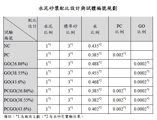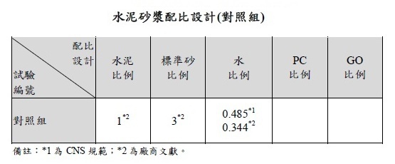 水泥砂漿配比設計區分兩階段,第一階段為水泥砂漿配比設計;第二階段為水泥砂漿流度試驗,第一階段係依據 CNS 1010 規範與文獻,以重量法設計出對照組水泥砂漿混凝土配比,CNS 規範及文獻之水灰比分別為 0.485 及 0.344,其他材料比例均採文獻,以利後續對照分析,水泥砂漿配比設計 (對照組) 請詳表 1。