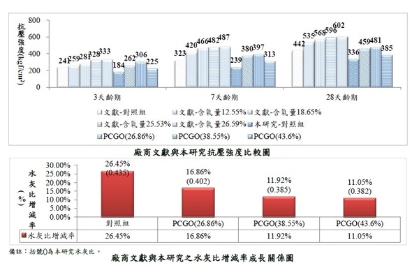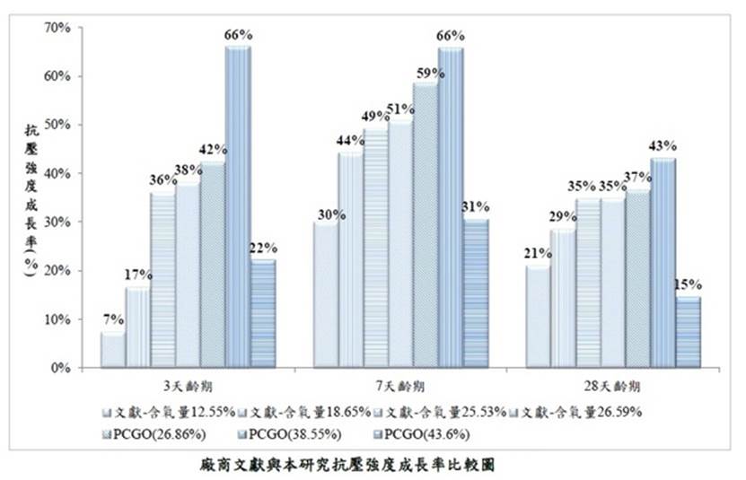 图 7 文献与本研究抗压强度成长率比较图 ,得知本研究 PCGO (26.86%) 与文献氧化程度 26.59% 最为相似, 3天、7天与 28 天龄期抗压强度成长率表现分别高出文献为 4% 、8% 、2% ,均优于文献表现。在适当氧化率下,不论文献或本研究抗压强度成长率表现,氧化率愈高,抗压强度成长率愈大,呈正比例关系,但氧化 43.6% 抗压强度呈现下滑趋势。