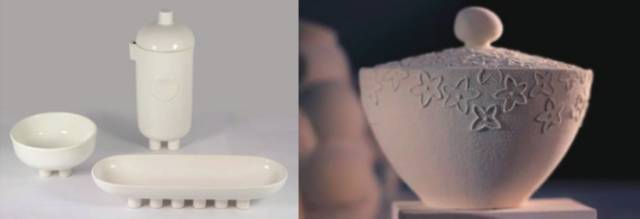 硅酸铝陶瓷粉末能够用于3D打印陶瓷产品。3D打印的该陶瓷制品不透水、耐热(可达600°C)、可回收、无毒,但其强度不高,可作为理想的炊具、餐具(杯、碗、盘子、蛋杯和杯垫)和烛台、瓷砖、花瓶、艺术品等家居装饰材料。