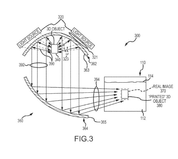 这一专利的核心在于其聚焦透镜技术,如此大量的光“注入”光敏树脂槽内,这需要巧妙地设计光折射,而我们知道光固化树脂有其固化波长范围。迪士尼聚焦透镜技术通过光学组件的反射或重定向聚焦来控制三维物体的外表面反射光波长,从而恰到好处地控制光敏树脂固化,形成精确光滑的固化表面。