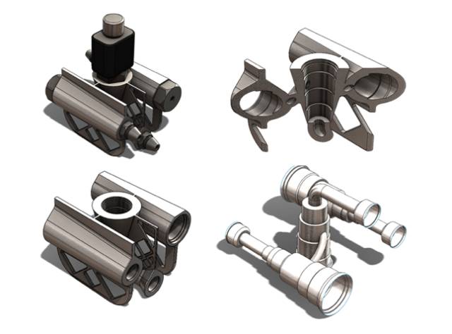 从优化产品的性能来出发,从提取流体路径开始,包括那些交叉钻孔设计,这跟传统机械加工从一个坚实的金属块开始不同,这一步需要把传统加工流体并不通过而只是为了加工需求而钻的孔的这部分设计去掉,留下那些流体会经过的管道和功能歧管。