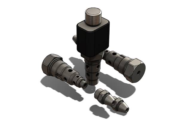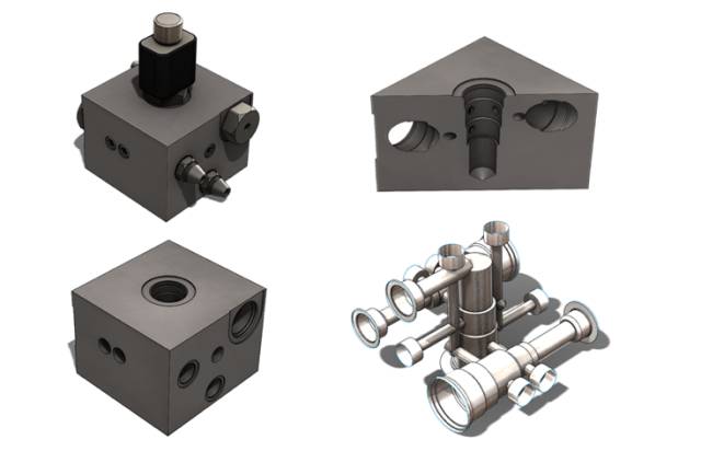先看一下液压岐管常见的设计问题:下图是一个经典的能承受200-500 bar压力的液压歧管。这个组件包括一个简单的电路组成的双止回阀、磁阀及其相关的出口端口。