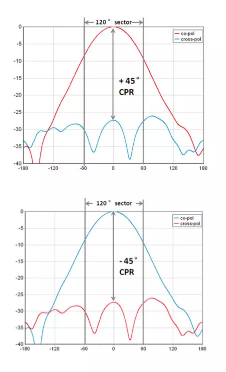 为了获得良好的上行分集增益,要求双极化天线应该具有良好的正交极化特性,即在±60º的扇形服务区内,交叉极化方向图电平应该比相应角度上的主极化电平有明显的降低,其差别(交叉极化比)在最大辐射方向应大15dB,在±60º内应大于10dB,最低门槛也应该大于7dB,如图所示。如此,才可以认为两个极化接收到的信号互不相关。