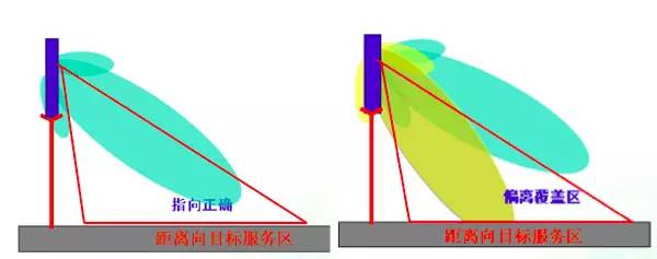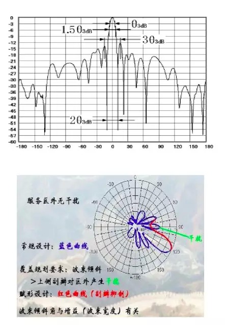 观察下图的垂直面方向图。波束应该适当下倾,下倾角度最好使得最大辐射指向图 中目标服务区的边缘。如果下倾太多(黄色),服务区远端的覆盖电平会急剧下降;如果下倾太少,覆盖在服务区外,且产生同频干扰问题。