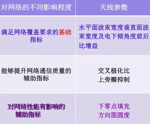 根据天线辐射参数对网络性能影响程度,可分类如下: