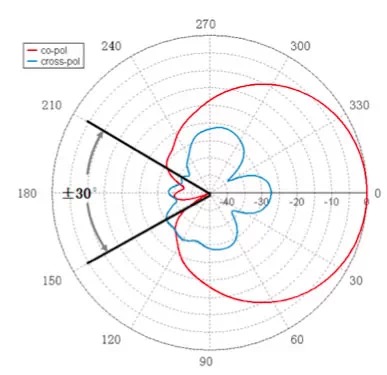 每个扇区的天线在最大辐射方向偏离±60º时到达覆盖边缘,需要切换到相邻扇区工作。在±60º的切换角域,方向图电平应该有一个合理的下降。电平下降太多时,在切换角域附近容易引起覆盖盲区掉话;电平下降太少时,在切换角域附近覆盖产生重叠,导致相邻扇区干扰增加。