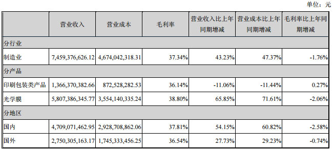 4月22日,康得新公布2015年年报,本年营业收入 745,937.66 万元,上年营业收入520,809.18 万元,增长 43.23%。本年营业成本 467,404.23 万元,上年营业成本 317,170.51 万元,增长47.37%。主要是由于随着光学膜的全面达产,光学膜的销售收入增长所致。
