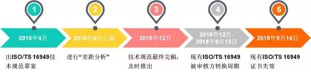 新版ISO/TS16949:2016认证标准预计于2016年12月份颁布,2016年2月8日,IATF已批准新版ISO/TS16949质量标准的初稿。2016年4月IATF召开新版ISO/TS16949认证标准的评审会议,将进一步收集各相关方的要求,发布标准的意见稿。2016年6月份开始,将在全球范围内征集意见,通过各相关方的意见反馈,进一步细化标准和相关准则。2016年12月完成新版ISO/TS16949认证标准的修订。