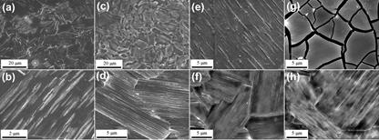 图9 具有基面堆垛层错结构镁合金的腐蚀表面膜和表面形貌:(a) (b) 体液中浸泡0.5h的表面膜;(c) (d) 体液中浸泡0.5h的腐蚀表面;(e)表面膜(2h);(f) 腐蚀表面(2h);(g) 表面膜(4h);(f) 腐蚀表面(4h)