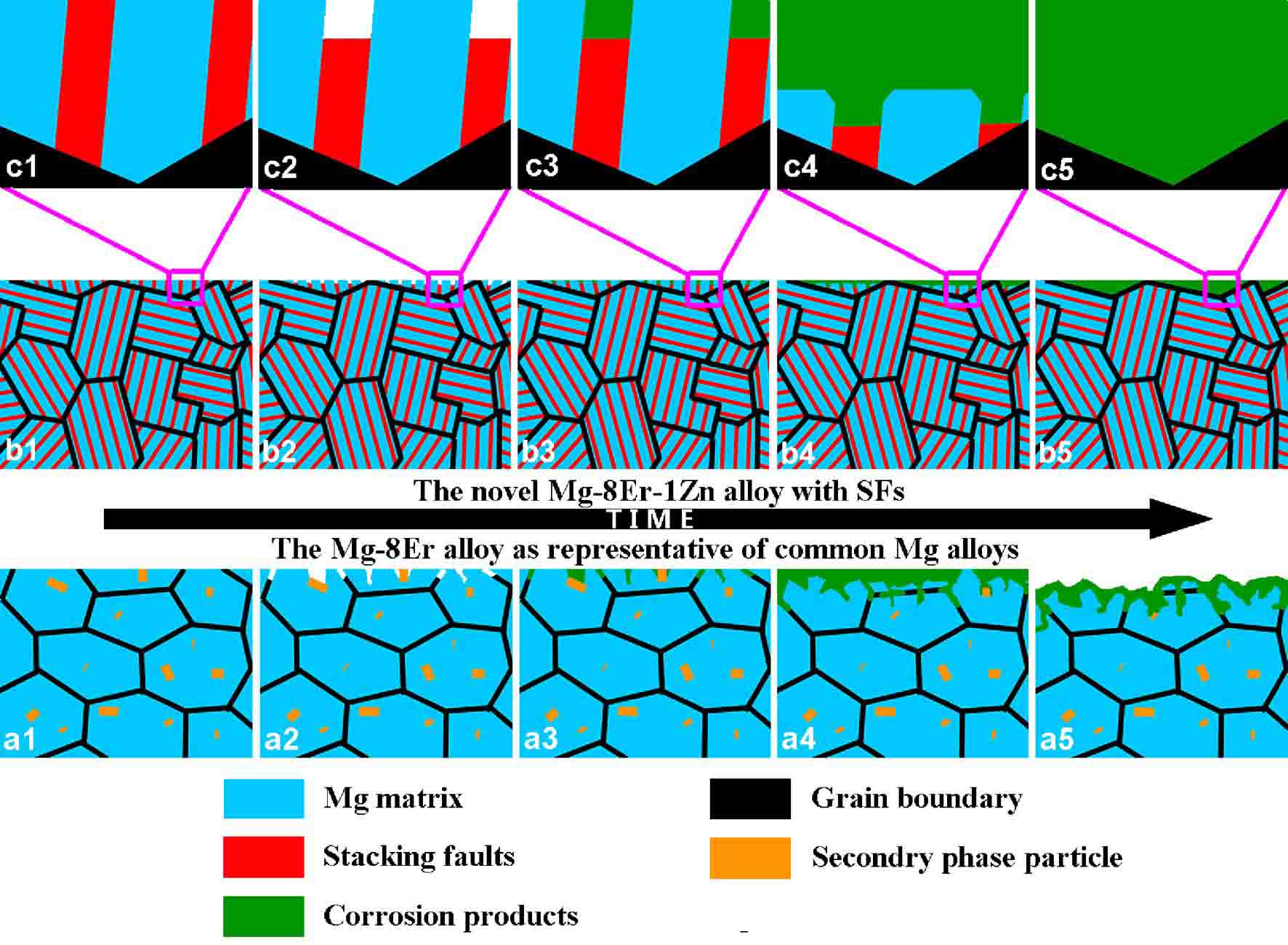 图11 (a1-a5)普通镁合金和含堆垛层错镁合金(b1-b5, c1-c5)腐蚀行为示意图