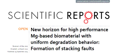 经过三年的创新研究,哈尔滨工程大学张景怀博士在生物可降解镁合金植入材料方面取得了阶段性成果,撰写了题为“New horizon for high performance Mg-based biomaterial with uniform degradation behavior: Formation of stacking faults”的论文,发表在Scientific Reports 期刊上,同时该成果申请了中国发明专利并已授权(ZL 201410384094.7)。