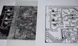 在覆铜板表面会涂一层感光液体,经过80度的温试烤干,再用菲林贴在PCB板上,再经过紫外线曝光机曝光,撕下菲林。