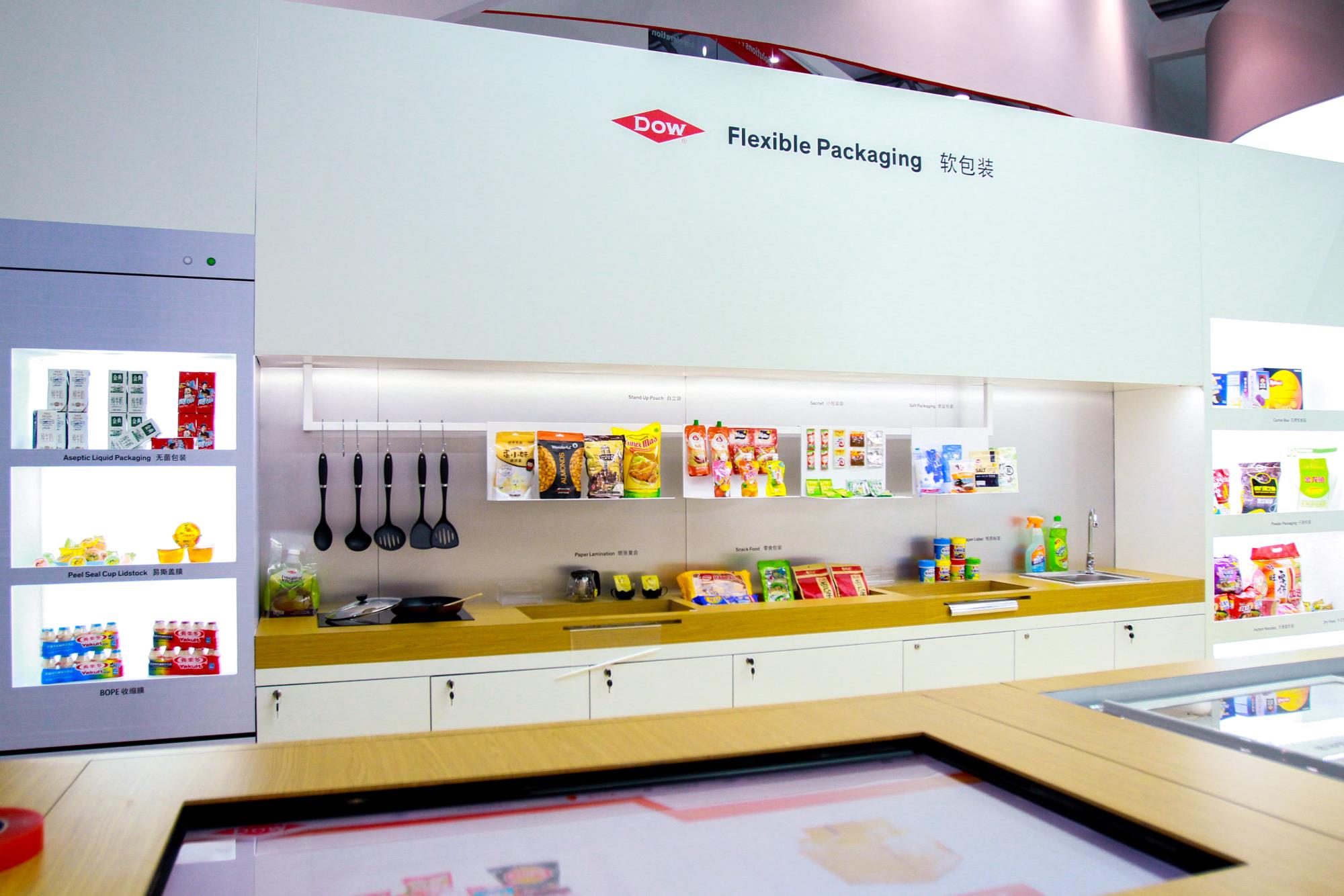 (图2:在1楼的厨房、浴室和儿童游戏房区域,陶氏展示了其软包装技术在食品与特种包装、胶粘剂功能材料和卫生与健康市场的广泛用途)