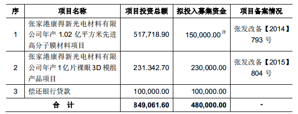 此前的《非公开发行股票预案》显示,康得新此次非公开发行股票数量不超过 14683.3894 万股,预计募集资金不超过 48亿元。其中15亿元投入年产1.02亿平方米新进高分子膜材料项目,年产1亿片裸眼3D模组产品项目将投入募集资金23亿元。