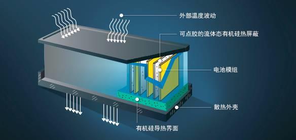 锂电池电解液中的碳酸酯具有较高的熔点,一般当温度低于-20℃时,电池不能正常工作[3];当温度过高时,电池隔膜会熔融造成短路引发电池起火等安全问题。只有保持适宜温度,电池才能达到其最佳性能。道康宁定制的有机硅材料能够有效为电池组及电芯散热,改善电池工作温度。同时,可点胶的流体态有机硅可在电池组形成一个围绕电池芯的热屏蔽,当环境过冷或过热时,电池依然能保持高效运作。