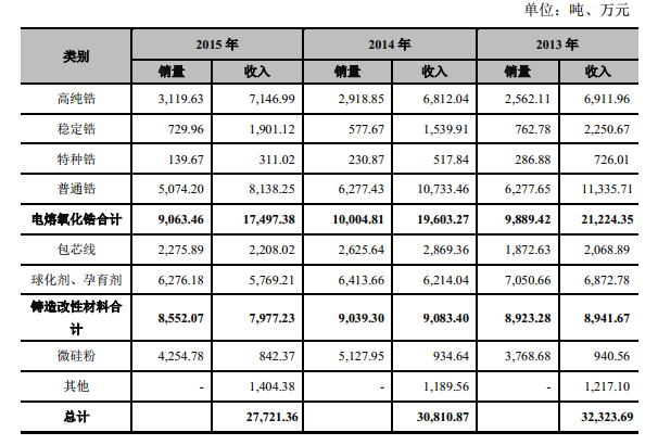 招股说明书显示,三祥新材主营业务包括电熔氧化锆和铸造改性材料。其中电熔氧化锆业务2015年占总营收的比例为63.12%。
