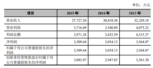 招股说明书披露的财报显示,2014年、2015年三祥新材的营业收入分别为3.08亿元、2.77亿元;净利润分别为3.03亿元和3.31亿元。
