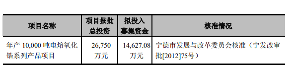 三祥新材本次发行募集资金投资项目主要用于电熔氧化锆系列高端产品的产能扩大,项目全部达产后,公司将新增10,000吨电熔氧化锆产能,用于升级公司产品结构,加大高新产品的技术投入。