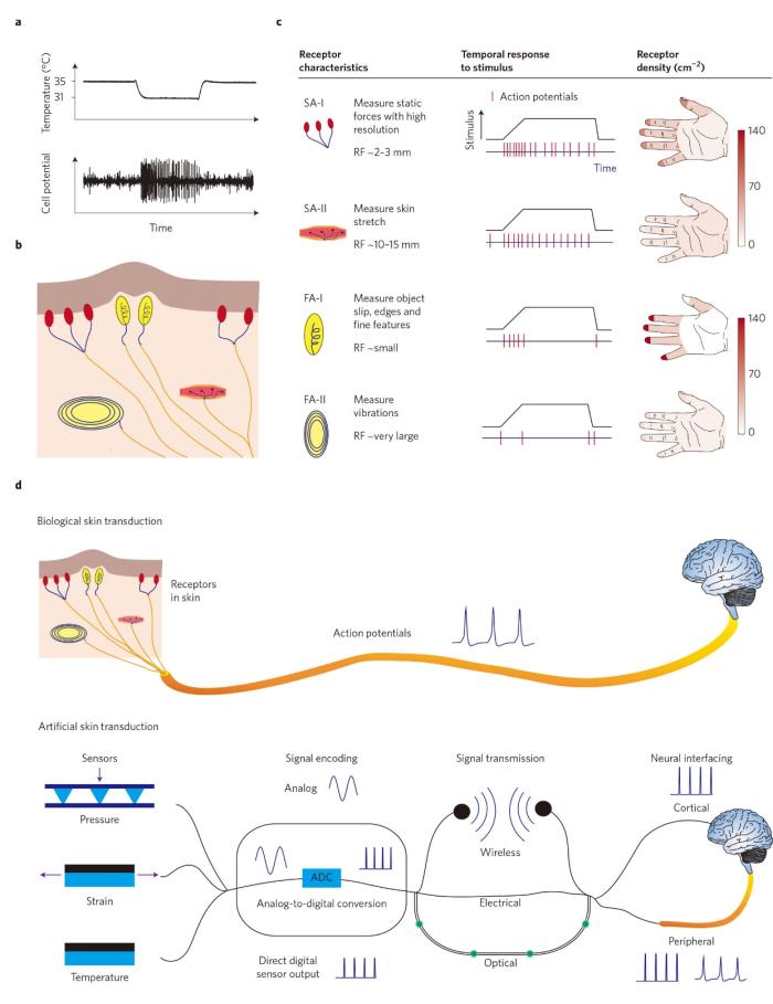 皮肤是我们与世界接触的重要媒介。利用电子器件重新创造皮肤的特性将对外科修复学和医药产生深远的影响。人造皮肤已经激发了人们对材料创新的巨大兴趣,包括机械稳定性和延展性、生物降解能力和大面积感知复杂多样性的能力。为能够制造机械性能优异和多功能的类皮肤电子器件以及改善脑/机接口以使得皮肤的信号可以传输到身体,人们正在大力发展新材料及其制备技术。最近美国斯坦福大学的鲍哲南教授在《自然-材料》发表了关于电子皮肤最新进展的综述,其中包括设计用于模仿皮肤感知和产生仿生信号能力的材料和设备等。(Nature Materials DOI: 10.1038/NMAT4671)