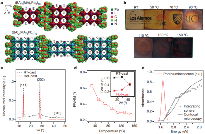 三维有机-无机钙钛矿具有优异的光电特性,目前已达到功率转化效率20%以上,但是,其环境稳定性和光学稳定性还需大幅提高。与之相反,Ruddlesden–Popper相(层状二维钙钛矿薄膜)具有优异的稳定性,但转化效率只有4.37%。最近,美国阿拉莫斯国家实验室的Tsai及其合作者通过制备接近单晶的层状钙钛矿,实现了高达12.52%的光电转化效率。没有封装的二维钙钛矿器件在恒定、标准照明下工作超过2250小时仍能保持原来效率的60%。封装之后,在标准条件下和潮湿的环境中,器件并没有表现出明显的性能衰减。(Nature DOI:10.1038/nature18306)