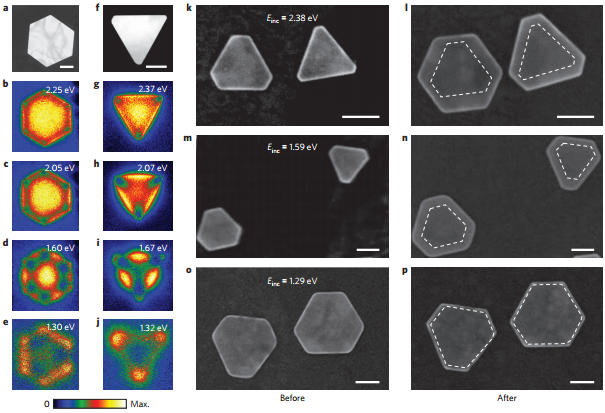 目前,适用于银纳米结构生长的等离子调制能否用于其它贵金属的合成尚不清楚,因为分子尺度控制的生长过程还未完全被理解。Wei等人利用等离子调制合成了金纳米棱柱,并在单纳米颗粒尺度上阐释了光化学合成机制的细节。研究发现:表面活性剂聚乙烯吡咯烷酮(PVP)沿着纳米棱柱的周边优先吸附,并且调节金纳米棱柱的各向异性生长。这一发现赋予PVP一项新的功能,并且与之前认知的PVP作为晶面阻止基团不同。(Nature Materials DOI:10.1038/NMAT4683)