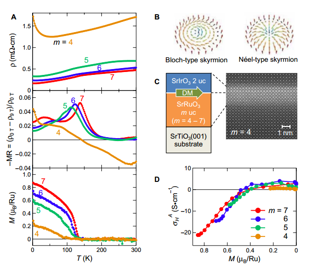 过去几年中,耦合磁场的电子输运引起了人们的关注。拓扑霍尔效应被认为是用于探测Dzyaloshinskii-Moriya (DM)相互作用和由此产生的磁性斯格明子的有力工具。这种相互作用出现于破损反演对称性中,因此,可以将其人工引入到界面上;最近在多层金属中验证了这一观点。但是,很少有通过电子输运来研究这类界面上DM相互作用的尝试。最近,Jobu等人通过制造外延氧化物界面证明了输运性与界面DM相互作用间的关联性。在很宽的温度和磁场范围内,由铁磁性的SrRuO3和顺磁性的SrIrO3组成的外延双分子层中发现了拓扑霍尔效应。拓扑霍尔效应的大小随SrRuO3厚度的减小而迅速降低,这表明界面DM相互作用起到了显著的作用。这种相互作用有望实现10nm尺寸的奈尔型磁性斯格明子。现有的结果证实高品质的氧化物界面让我们可以调整有效DM相互作用。这可能是迈向未来拓扑电子学的重要一步。(Science Advances DOI: 10.1126/sciadv.1600304)