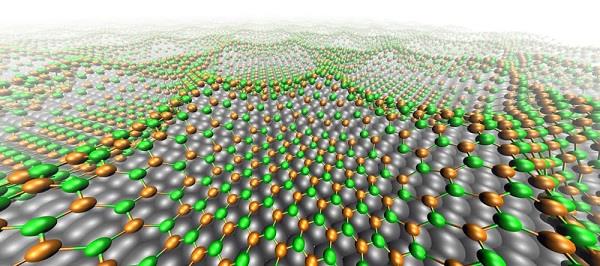 由氮化硼纳米网织造的“超级蜂窝”,绿点为氮、橙点为硼、灰色为铑原子。