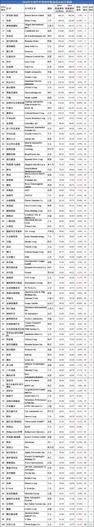 2016年全球汽车供应商百强榜 中国企业首次闯入20强