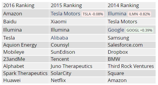 表1 《麻省理工科技评论》2014年-2016年“最智能”公司前十名