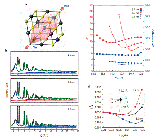 胶体硫属铅化合物量子点大小和形状可调而且具有低成本的加工方法,这使它成为新一类可用于新型光伏,热电和光电子器件的基础材料。尽管核心和表面区域的原子顺序和化学计量差别很大,铅的硫属化合物量子点确是已知的岩盐型结构结晶。但在此之前,对于极小型化和表面诱导配体效应对结构畸变的影响并没有令人信服的证明。意大利的科学及及其合作者利用最前沿的X射线散射技术和密度泛函理论计算,证明了在尺寸低于8nm时,PbS和PbSe量子点随着配体诱导拉伸应变驱动下的铅亚晶格的位移,经历了晶格畸变。由此产生的固定电偶极子可能对这些量子点的定向附着产生影响。证据来自于一种中心铅原子缺陷的发现和在合成量子点中具有非极性{110}晶面的菱形十二面体的形状。一旦改变表面配体的本质,就会发现晶格应变的差异。(Nature materials DOI:10.1038/NMAT4661)