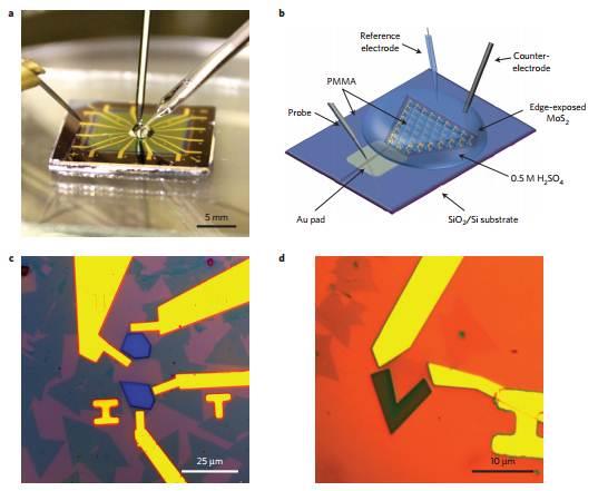 MoS2边界上极好的电催化析氢性能已经促使研究人员想方设法增加边界浓度。2H基面的导电性较差导致电荷转移不够有效,影响了其电催化析氢性能。最近,美国的科学家研究发现:通过基底与MoS2纳米片的电子耦合,单层MoS2纳米片的2H基面能够表现出与目前金属边界和1T相MoS2相比拟的电催化析氢性能。起始电位和塔菲尔斜率分别为0.1V和50mV/dec。有效的电荷注入和硫空位的出现对于催化性能的提高起到了主要作用。(Nature Materials DOI: 10.1038/NMAT4660)